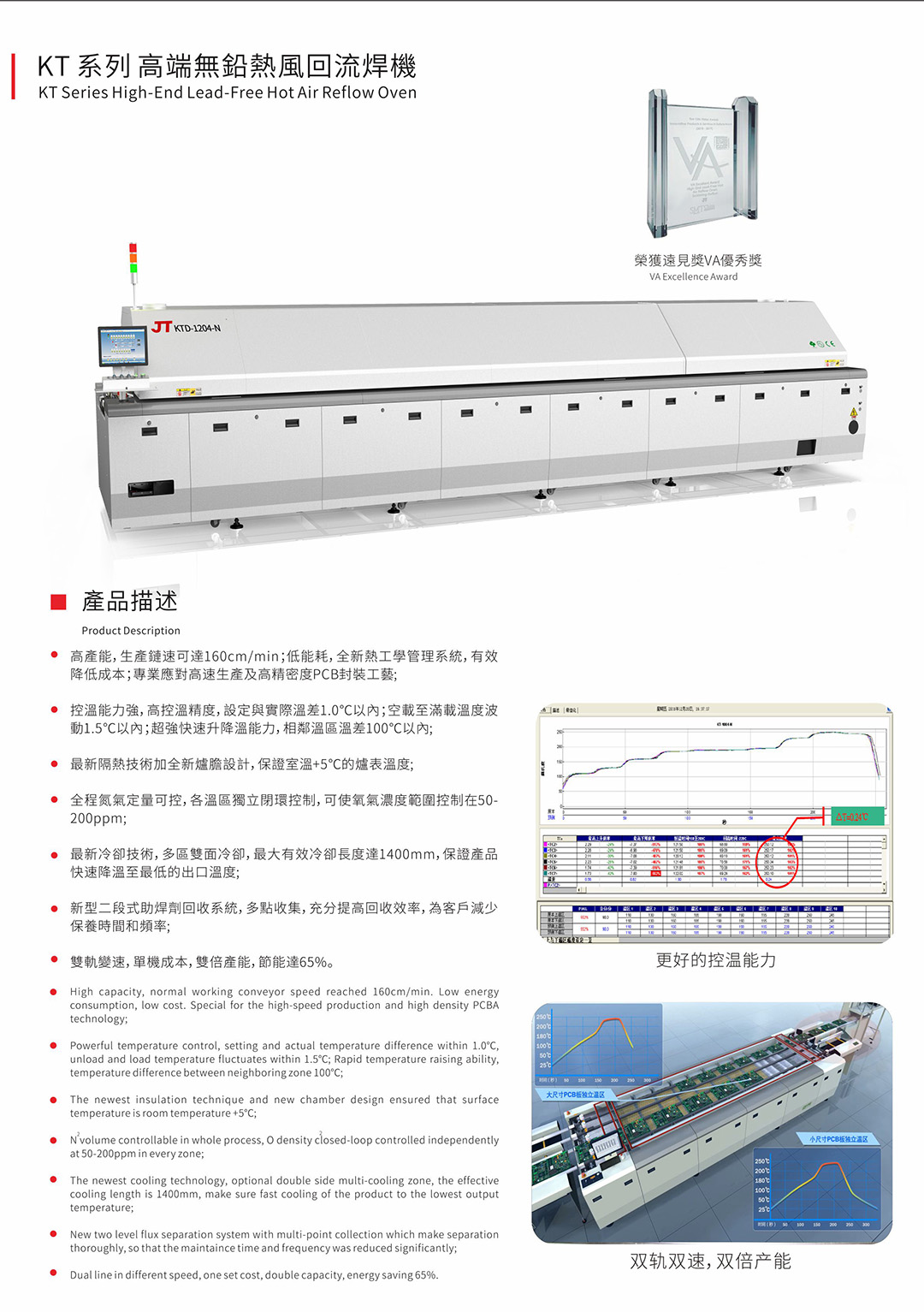 高產(chǎn)能,正常生產(chǎn)鏈速可達(dá)160cm/min;低能耗,全新熱工學(xué)管理系統(tǒng),有效降低成本.專業(yè)應(yīng)對高速生產(chǎn)及高精密度PCB封裝工藝.控溫能力強(qiáng),高控溫精度,設(shè)定與實際溫差1.0℃以內(nèi);空載至滿載溫度波動1.5℃;超強(qiáng)快速升降溫能力,相鄰溫區(qū)溫差100℃以內(nèi).隔熱技術(shù)加全新爐膽設(shè)計保室溫+5℃左右的爐表溫度.全程氮氣定量可控,各溫區(qū)獨…